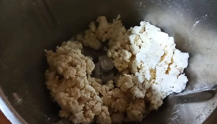 Controllate che il formaggio sia ben grattugiato e versare tutti gli altri ingredienti. Impostate il bimby in modalità spiga per 5 secondi e controllate che il composto abbia formato tante briciole grosse, se è necessario proseguite per qualche altro secondo finchè il vostro composto raggiungerà questa consistenza: